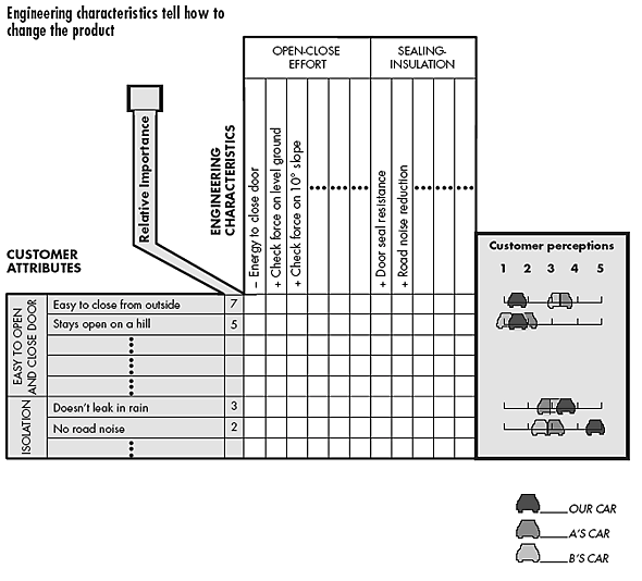 예로, 도요타는 품질의 집을 활용하여 녹 방지(rust prevention) 부문에서의 순위를 끌어올렸습니다. 디자이너는 품질의 집을 사용해 "차체 내구도"라는 개념을 기후에서 운영모드에 이르는 53가지 아이템으로 나누었습니다. 그리고 그들은 생산의 모든 상세한 부분에 대해서 고객의 평가를 얻고 실험을 진행하였습니다. 최종적으로 시트 금속 소재, 코팅 소재, 열처리 온도가 중요한 측면이고 고객에게 가장 중요한 부분인 것을 발견하였습니다.