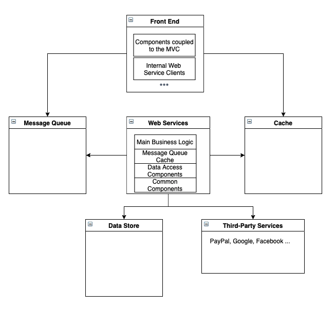 front-end 및 웹 서비스는 상태가 없어야 하기 때문에, 웹 애플리케이션은 캐시와 메시지 큐 같은 추가적인 컴포넌트를 필요로 하게 됩니다.
